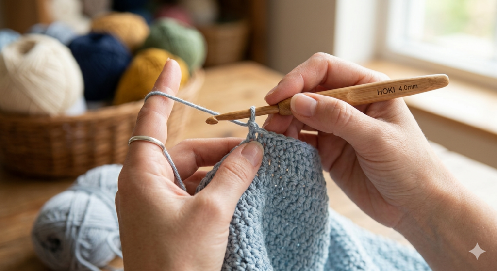 Uma das maiores dúvidas para iniciantes é como segurar corretamente a linha e a agulha. A boa notícia é que não existe um jeito “certo” universal — o importante é encontrar a forma que seja mais confortável para você e que permita que a linha corra suavemente entre os dedos enquanto você trabalha.